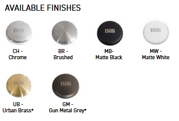 Finishes: Chrome (CH), Brushed (BR), Matte White (MW), Matte Black (MB), Urban Brass (UB) & Gun Metal Grey (GM)